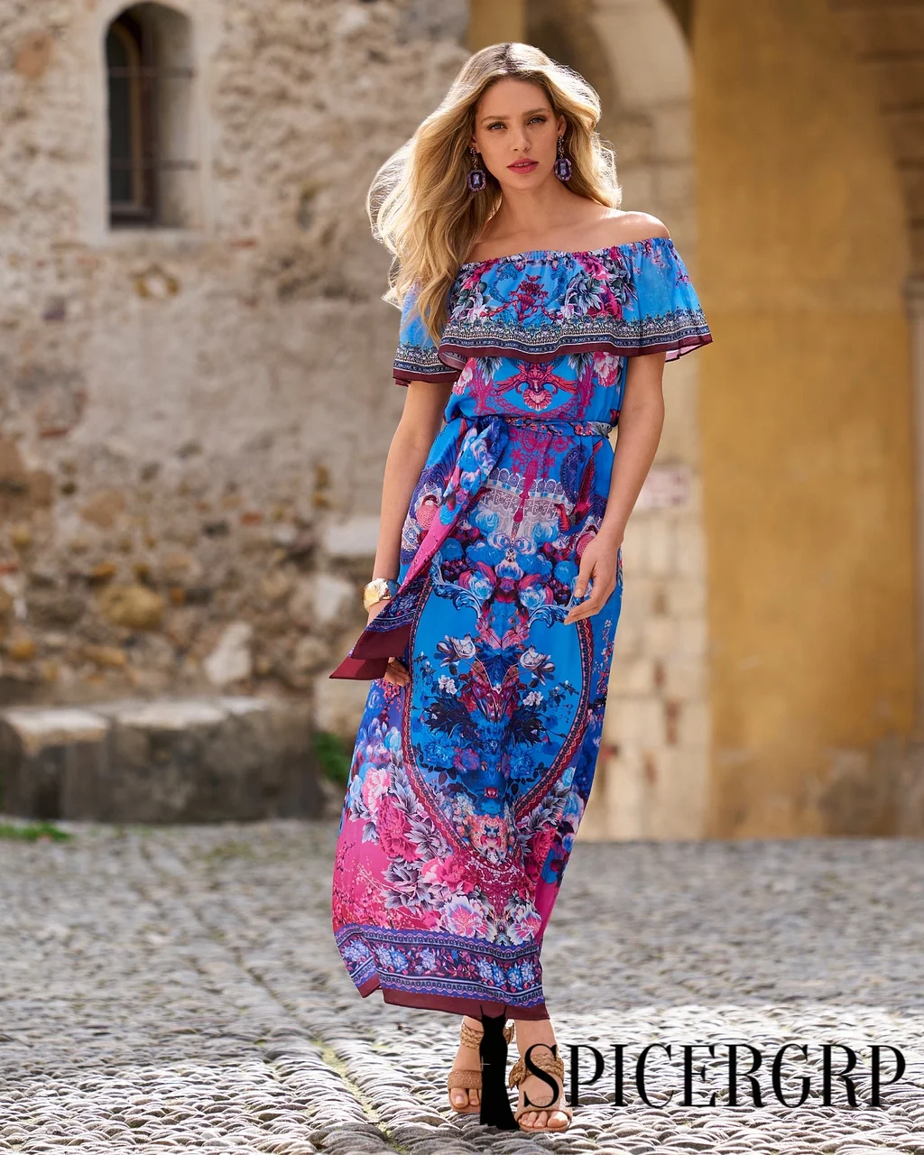 A boho-chic dream takes shape on our Floral Border Print Ruffle Off-The-Shoulder Maxi Dress. Its bold, western-inspired floral print elevates an effortless, off-the-shoulder silhouette to create a style standout for getaways and the everyday.