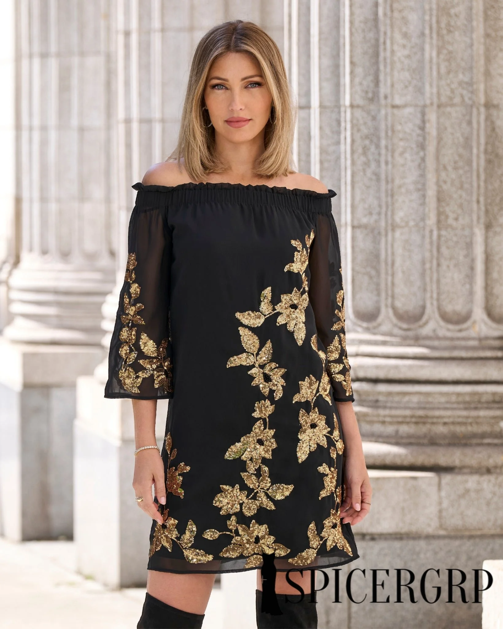 Our Gold Sequin Embellished Off the Shoulder Shift Dress is crafted from Georgette crêpe fabric with a beautiful drape and enhanced with gold-sequin floral vines. Flounce sleeves, elastic shoulder reveal, and a ruffle detail carry through the effortless, feminine feel on this one-of-a-kind design.